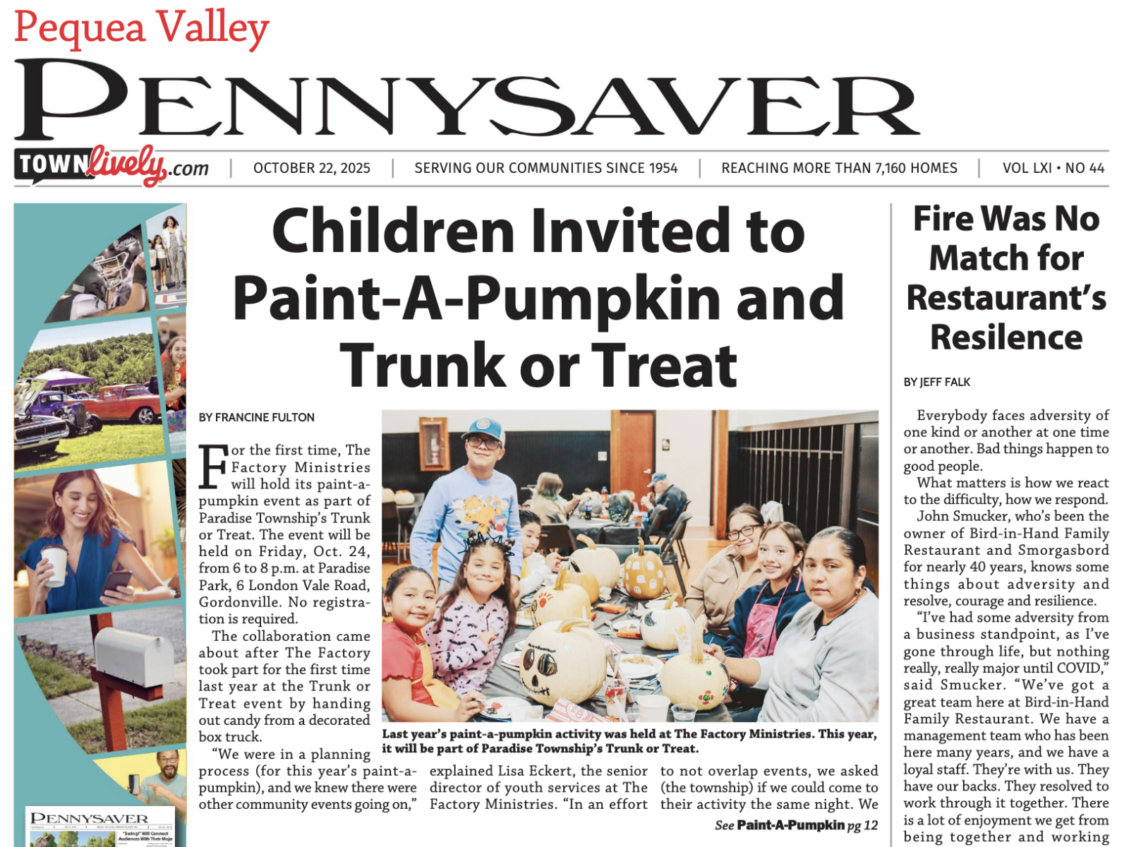 Article in the Pequea Valley Pennysaver, by Francine Fulton about The Factory Ministries partner event with Paradise Township. To read click https://issuu.com/engleprintingandpublishing/docs/peq_102225
