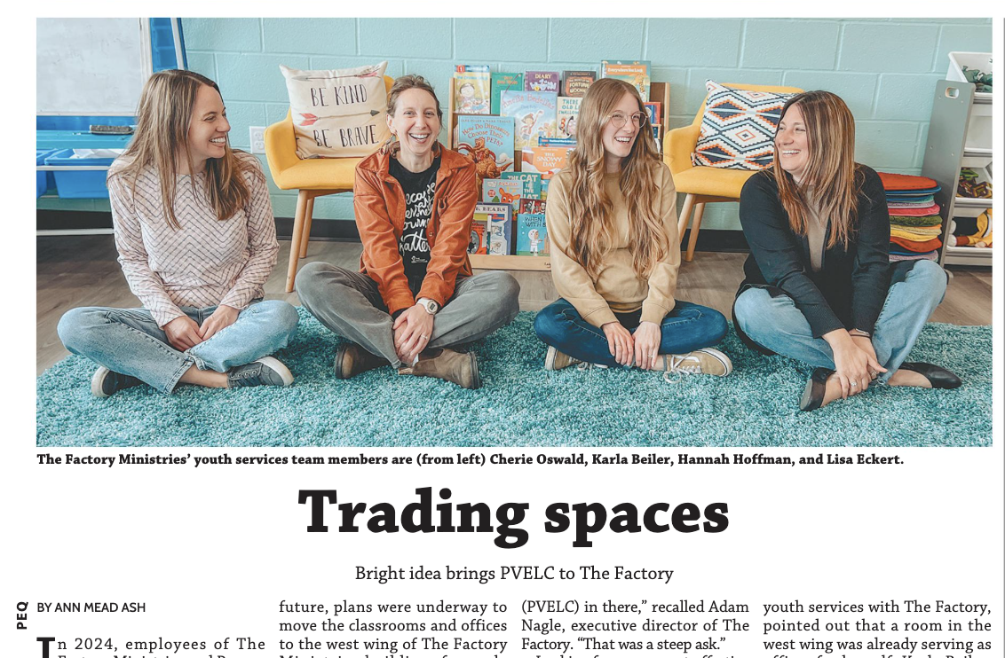Article in the Pequea Valley Pennysaver, by Ann Mead Ash about The Factory Ministries bringing PVELC to The Factory. To read click https://issuu.com/engleprintingandpublishing/docs/peq_041625