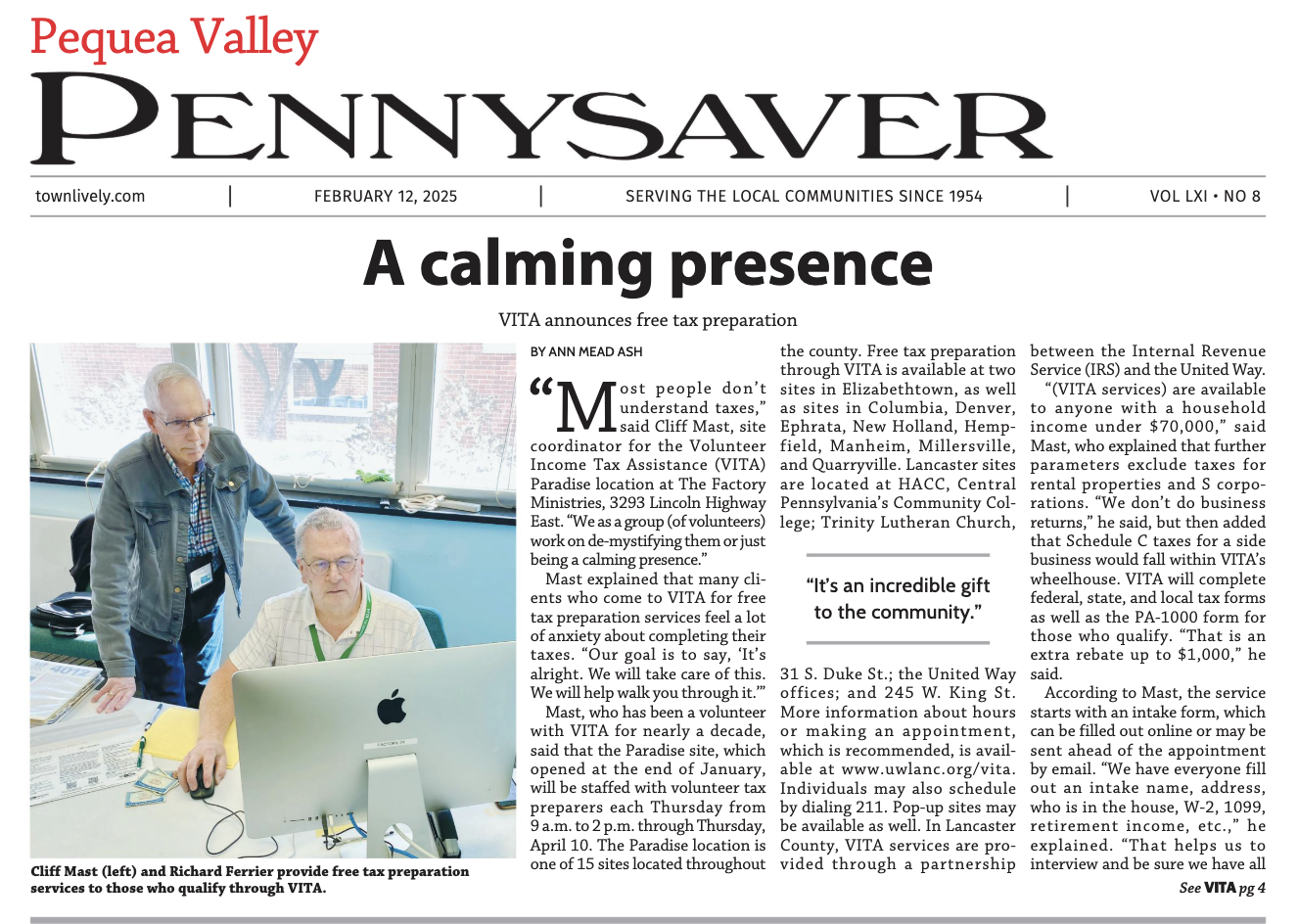 Article in the Pequea Valley Pennysaver, by Ann Mead Ash about the VITA program held at The Factory Ministries. To read click https://issuu.com/engleprintingandpublishing/docs/peq_021225