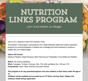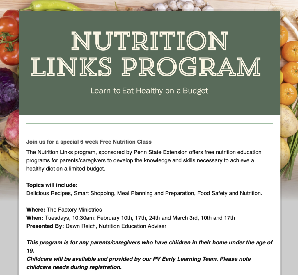 The Nutrition Links program, sponsored by Penn State Extension offers free nutrition education programs for parents/caregivers to develop the knowledge and skills necessary to achieve a healthy diet on a limited budget.