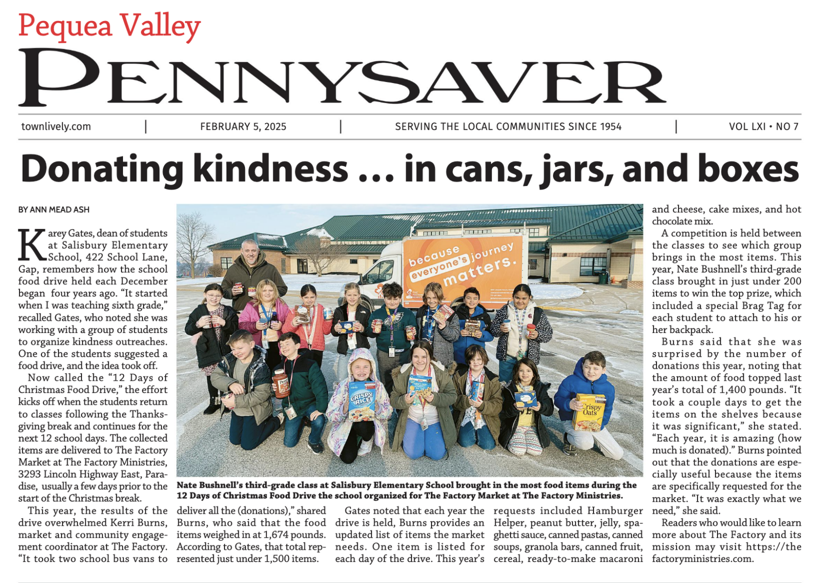 Article in the Pequea Valley Pennysaver, by Ann Mead Ash about Salisbury Elementary School’s food donations to The Factory Market. To read click https://issuu.com/engleprintingandpublishing/docs/peq_020525