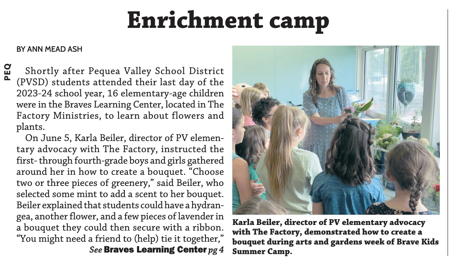 Article in the Pequea Valley Pennysaver, by Ann Mead Ash about The Factory Summer Camps. To read click: https://issuu.com/engleprintingandpublishing/docs/peq_062624