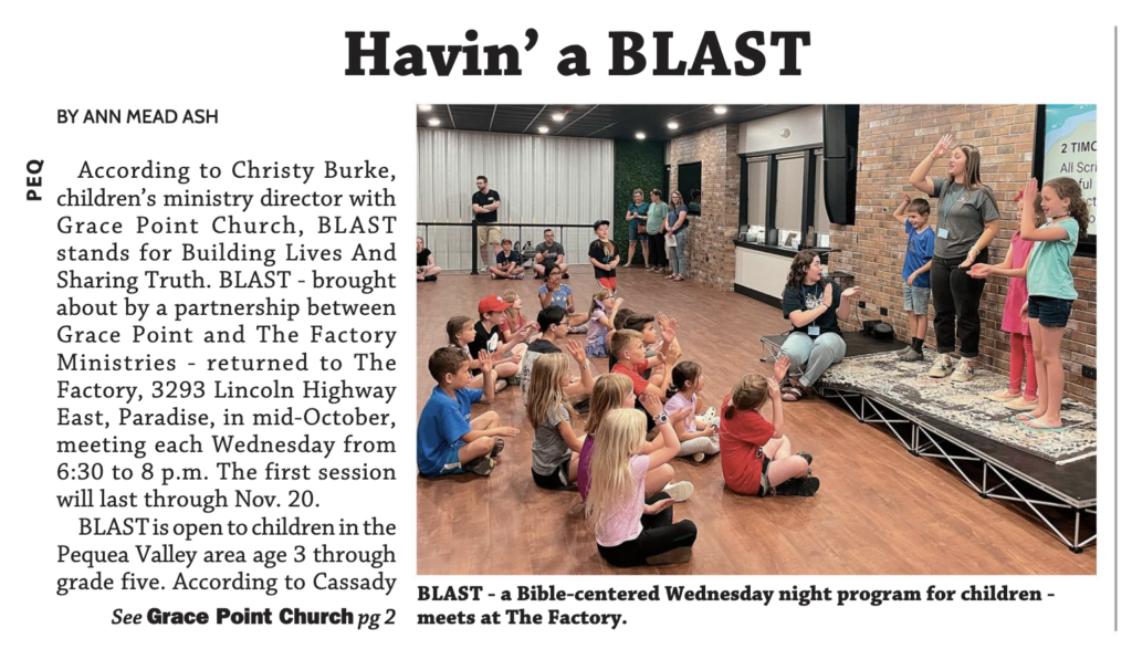 Article in the Pequea Valley Pennysaver, by Ann Mead Ash about a Grace Point Church event hosted at The Factory. To read click: https://issuu.com/engleprintingandpublishing/docs/peq_103024