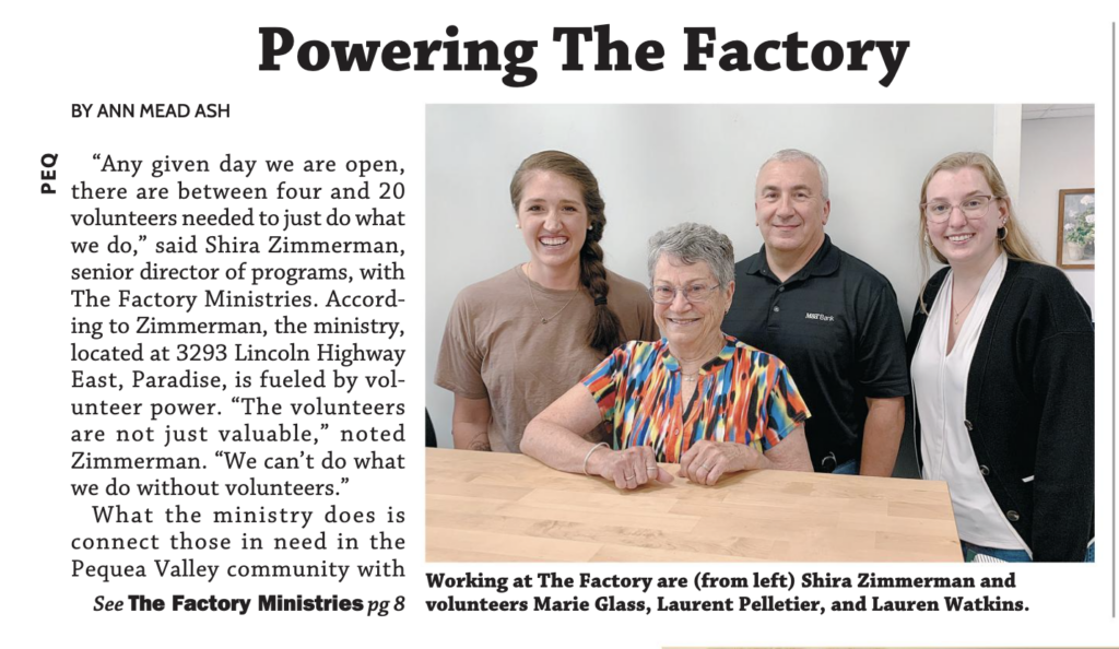 Article in the Pequea Valley Pennysaver, by Ann Mead Ash about The Factory volunteers. To read click: https://issuu.com/engleprintingandpublishing/docs/peq_061224