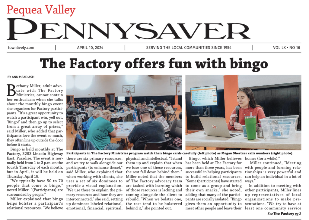 Article in the Pequea Valley Pennysaver, by Ann Mead Ash about The Factory bingo program. To read click: https://issuu.com/engleprintingandpublishing/docs/peq_041024