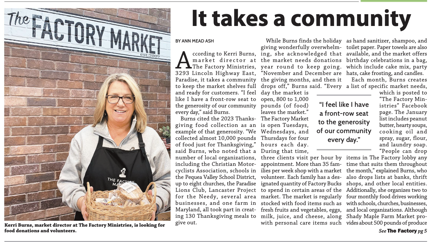 Article in the Pequea Valley Pennysaver, by Ann Mead Ash about The Factory Market. To read click: https://issuu.com/engleprintingandpublishing/docs/peq_011724