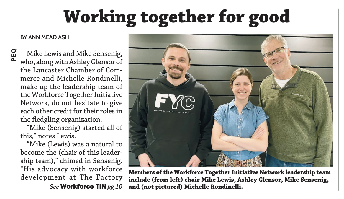 Article in the Pequea Valley Pennysaver, by Ann Mead Ash about The Factory Workforce Together Initiative Network leadership team. To read click https://issuu.com/engleprintingandpublishing/docs/peq_043025