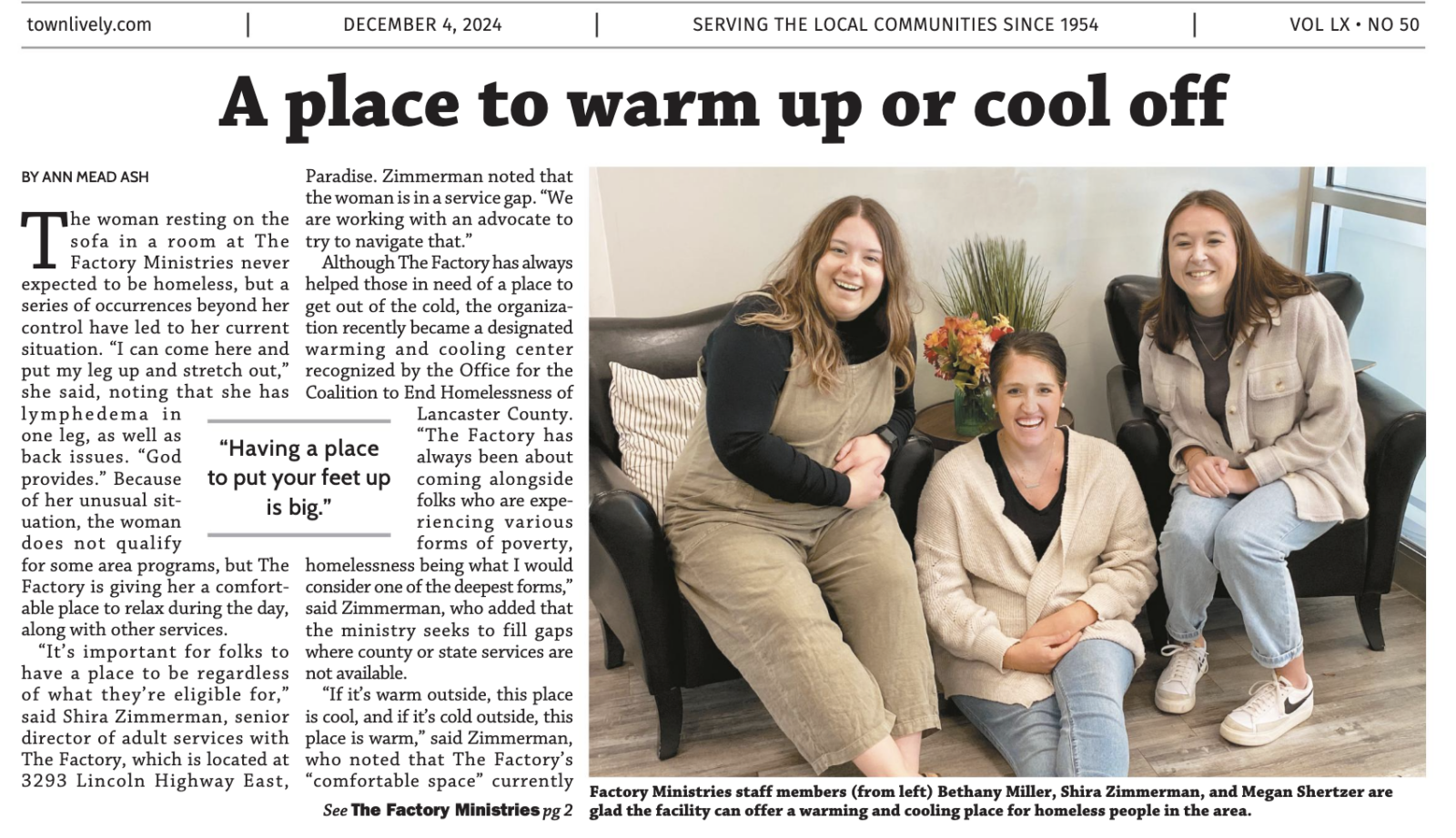 Article in the Pequea Valley Pennysaver, by Ann Mead Ash about The Factory’s warming and cooling rooms. To read click: https://issuu.com/engleprintingandpublishing/docs/peq_120424